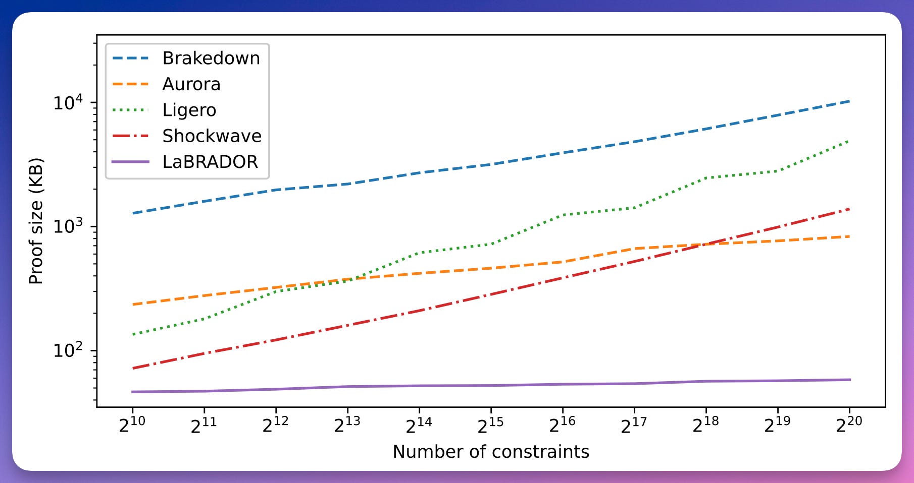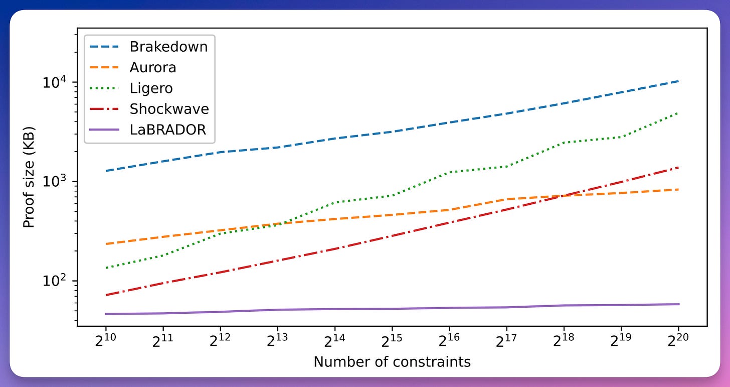 At the 128 bits security level, LaBRADOR proves knowledge of a solution for an R1CS mod 2^64+1 with 2^20 constraints, with a proof size of only 58 KB