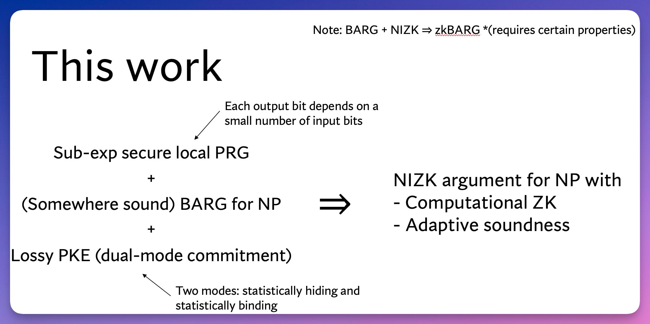 show how to combine a batch argument for NP with a local pseudorandom generator and a dual-mode commitment scheme to obtain a NIZK for NP.