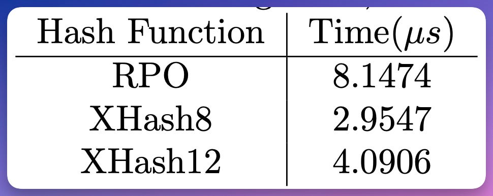 XHash8 performs ≈2.75 times faster than RPO, and XHash12 performs ≈2 times faster than RPO