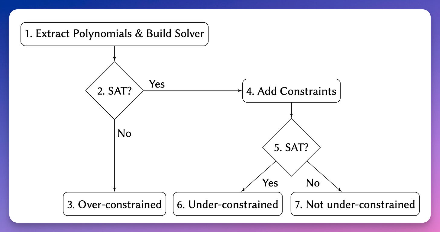SMT solver can detect under-constrained (in the sense that for the same public input they have two efficiently computable satisfying assignments) circuits.