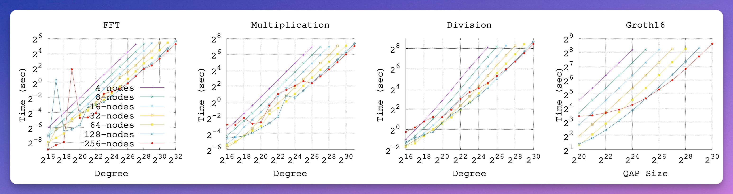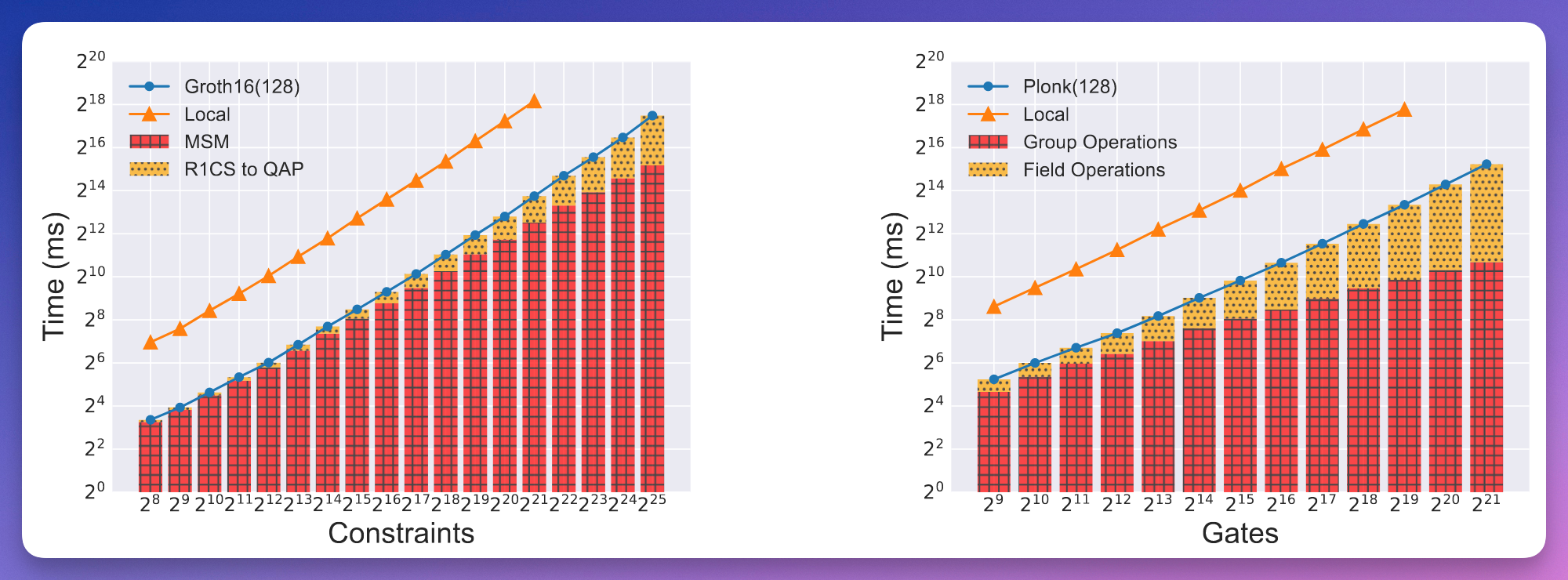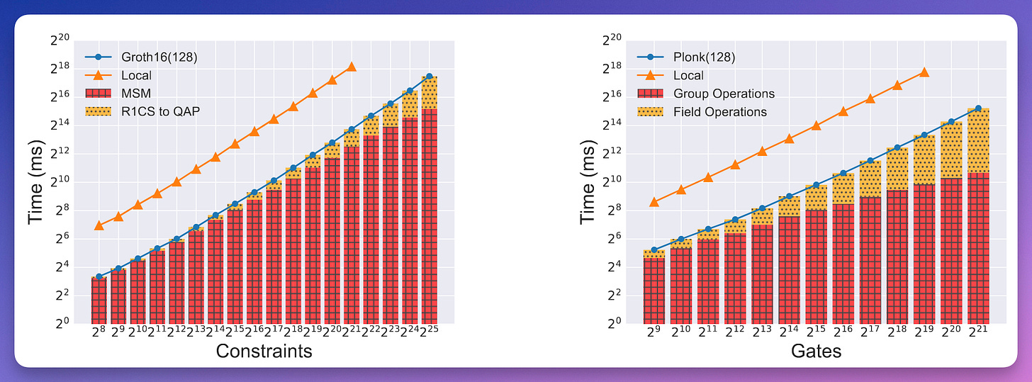 instantiate this framework with custom protocols to obtain faster runtimes than local provers for widely used zk-SNARKs, such as Groth16 , Marlin and Plonk. get ≈22× speed-up when run with 128 parties for 2^25 constraints with Groth16 and 2^21 gates with Plonk.